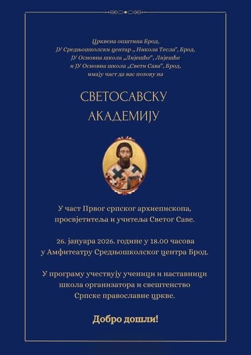 Црквена општина Брод, Средњошколски центар „Никола Тесла“ и основне школе „Свети Сава“ и Лијешће, организују Светосавску академију у част првог српског архиепископа, просветитеља и учитеља Светог Саве.