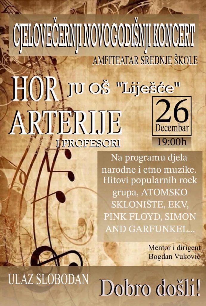 Хор Основне школе „Лијешће“, бенд „Артерије“ и професори организују Новогодишњи концерт у петак, 26. децембра, са почетком у 19:00 часова, у амфитеатру Средњошколског центра „Никола Тесла“ у Броду.