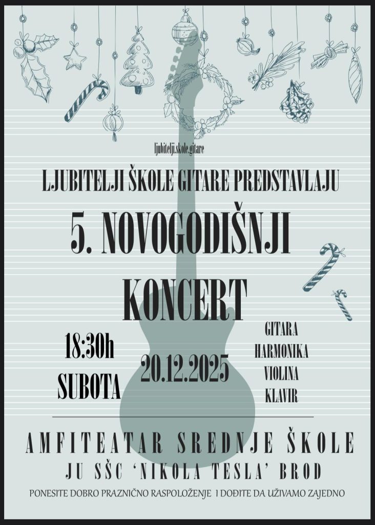 У суботу, 20. децембра 2025. године, са почетком у 18:30 часова, у амфитеатру Средњошколског центра „Никола Тесла“ у Броду, одржаће се пети по реду новогодишњи концерт Удружења „Љубитељи школе гитаре“.