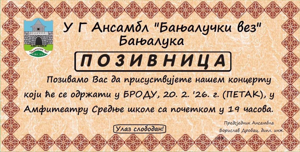 Општина Брод са задовољством најављује цјеловечерњи концерт ансамбла „Бањалучки вез“, који ће бити одржан у петак, 20. фебруара са почетком у 19:00 часова, у амфитеатру Средњошколског центра „Никола Тесла“.